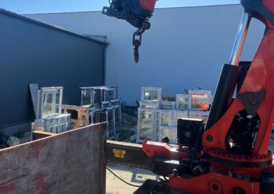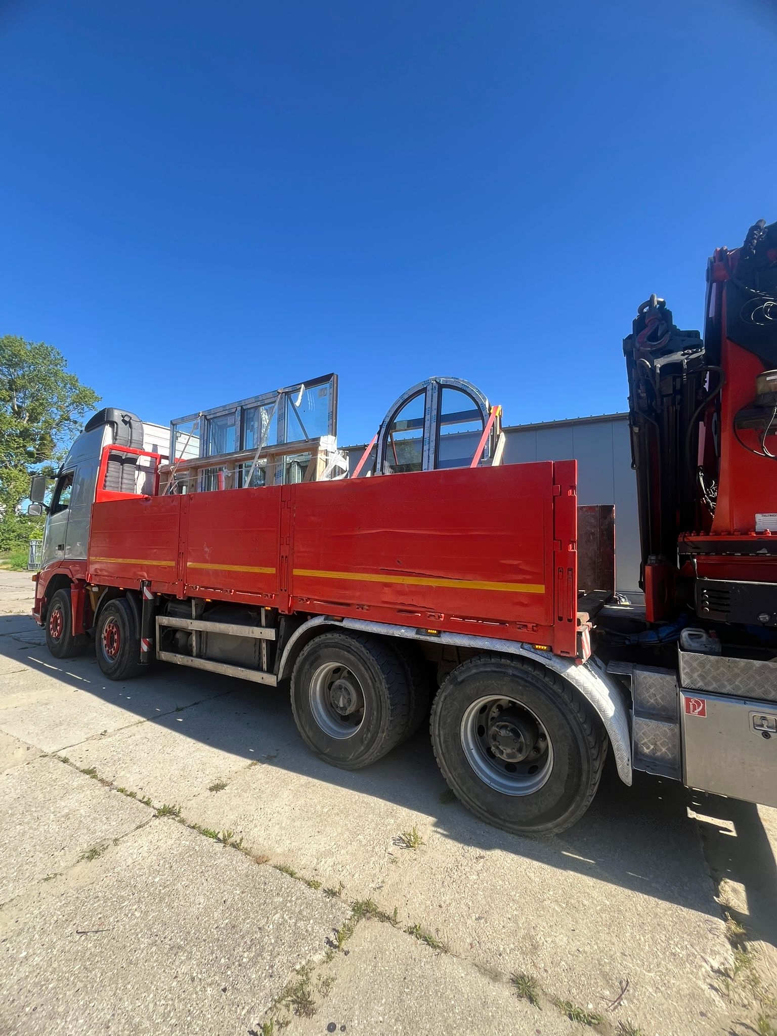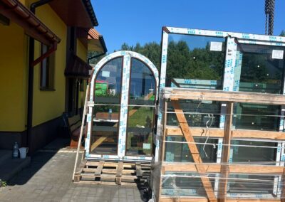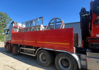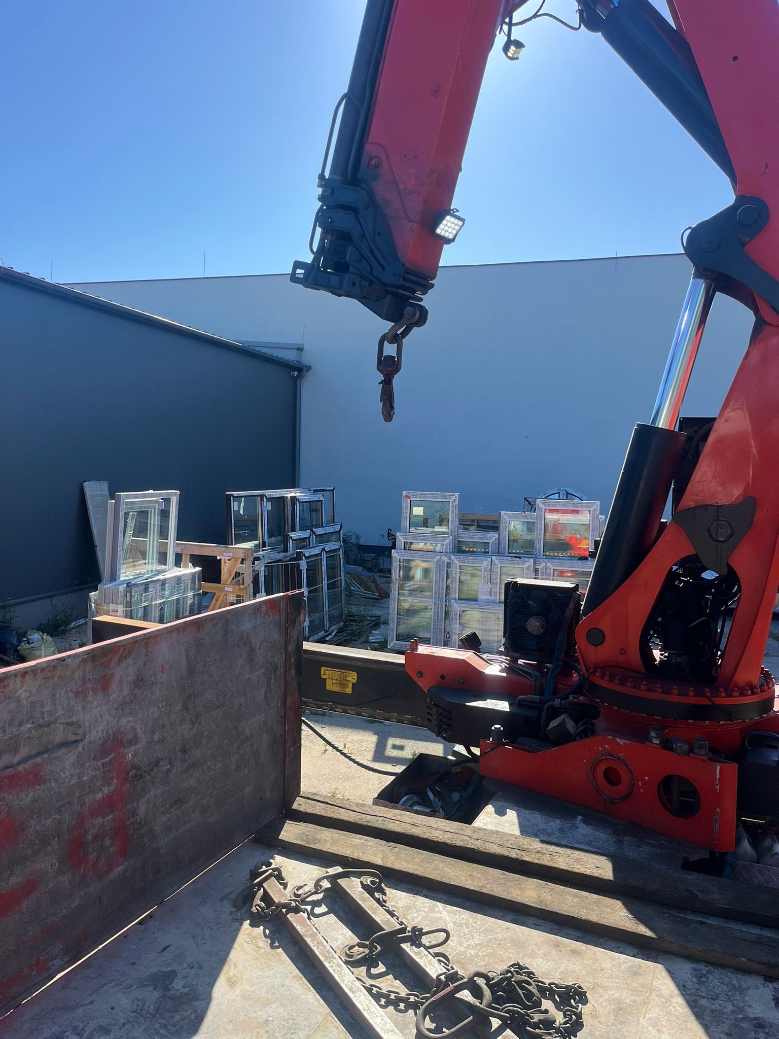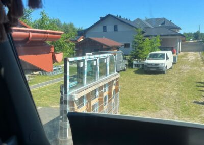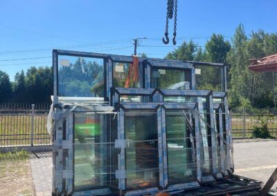 Dzięki hydraulicznemu dźwigowi zamontowanemu na ciężarówce (HDS), możliwe było szybkie i sprawne zdjęcie stolarki bez potrzeby użycia dodatkowych maszyn. Zasięg naszego żurawia pozwolił na przeniesienie okien bezpośrednio na teren budowy – w wyznaczone miejsce wskazane przez klienta.