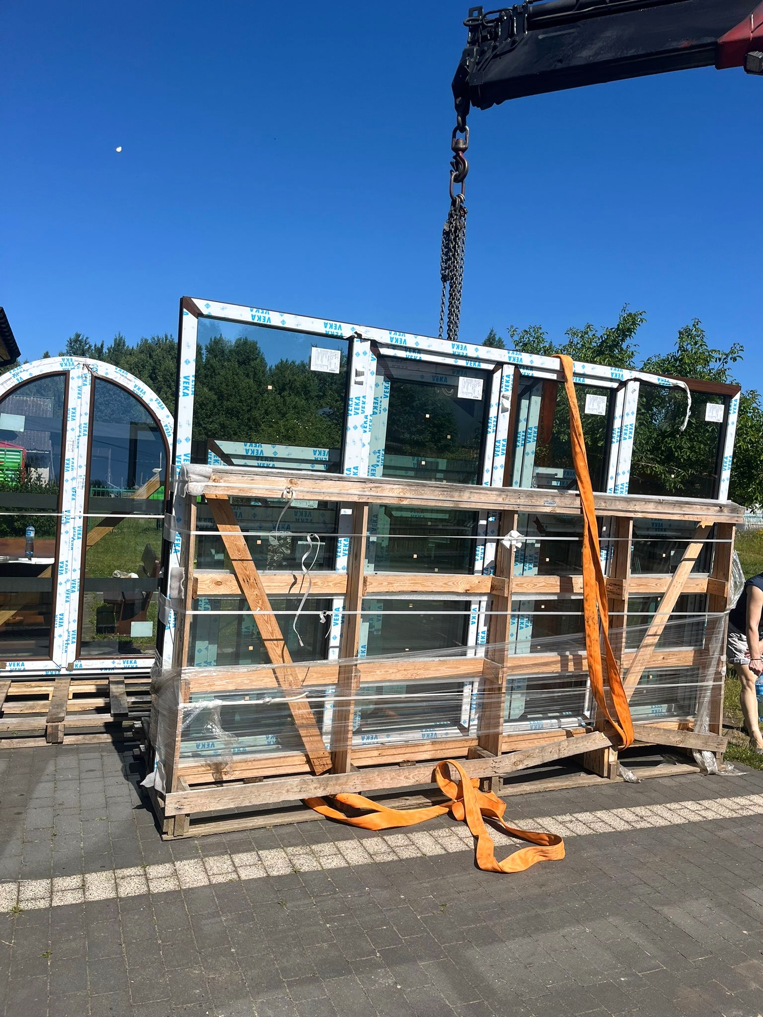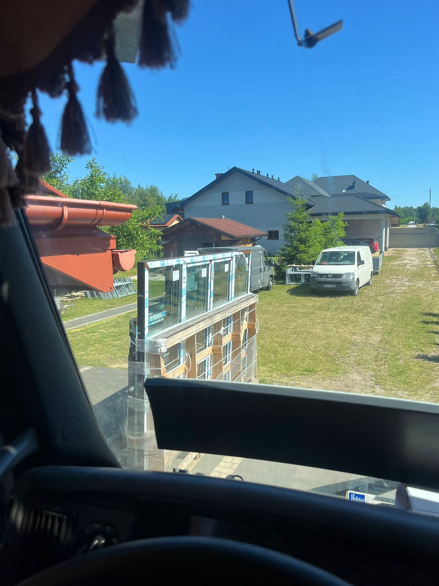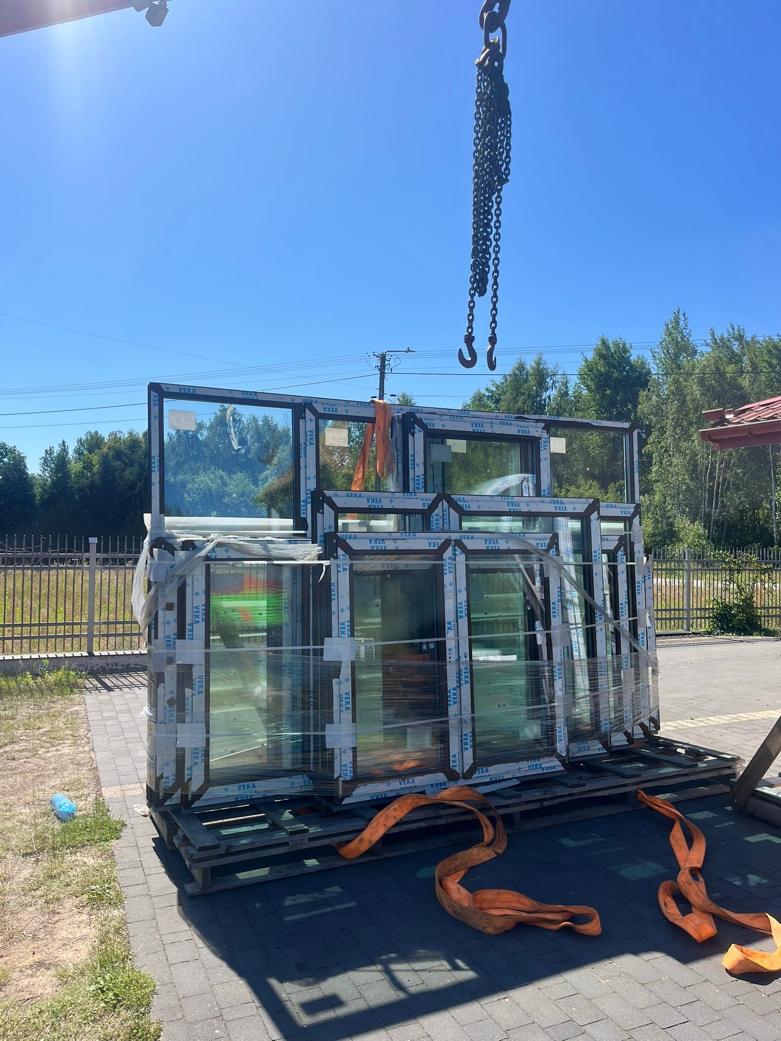 Dzięki hydraulicznemu dźwigowi zamontowanemu na ciężarówce (HDS), możliwe było szybkie i sprawne zdjęcie stolarki bez potrzeby użycia dodatkowych maszyn. Zasięg naszego żurawia pozwolił na przeniesienie okien bezpośrednio na teren budowy – w wyznaczone miejsce wskazane przez klienta.